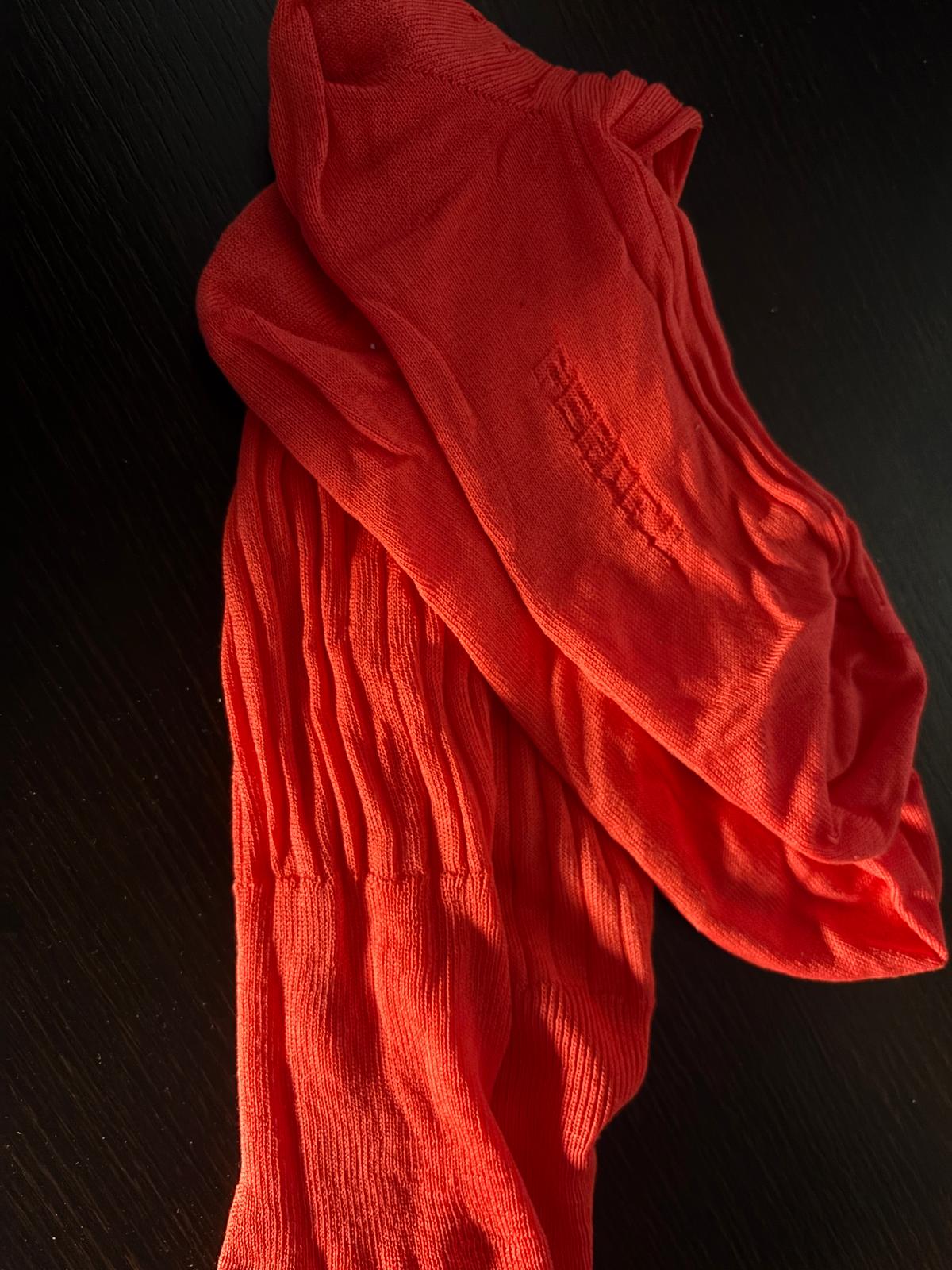 Infine, tra le pieghe dell’armadio, è riemerso un paio di calzini in lino Perofil di un arancione vibrante. Li acquistai ben prima di scegliere i colori di CONSUMERISMO.