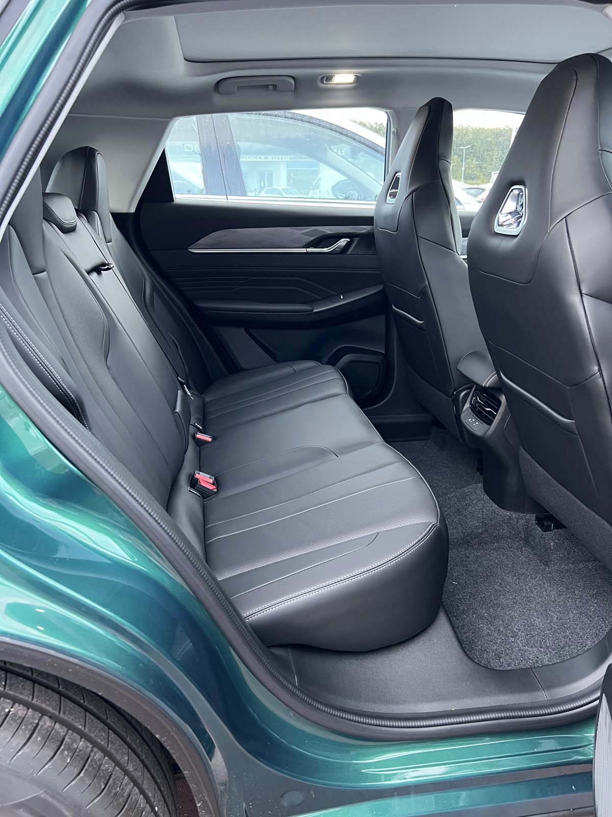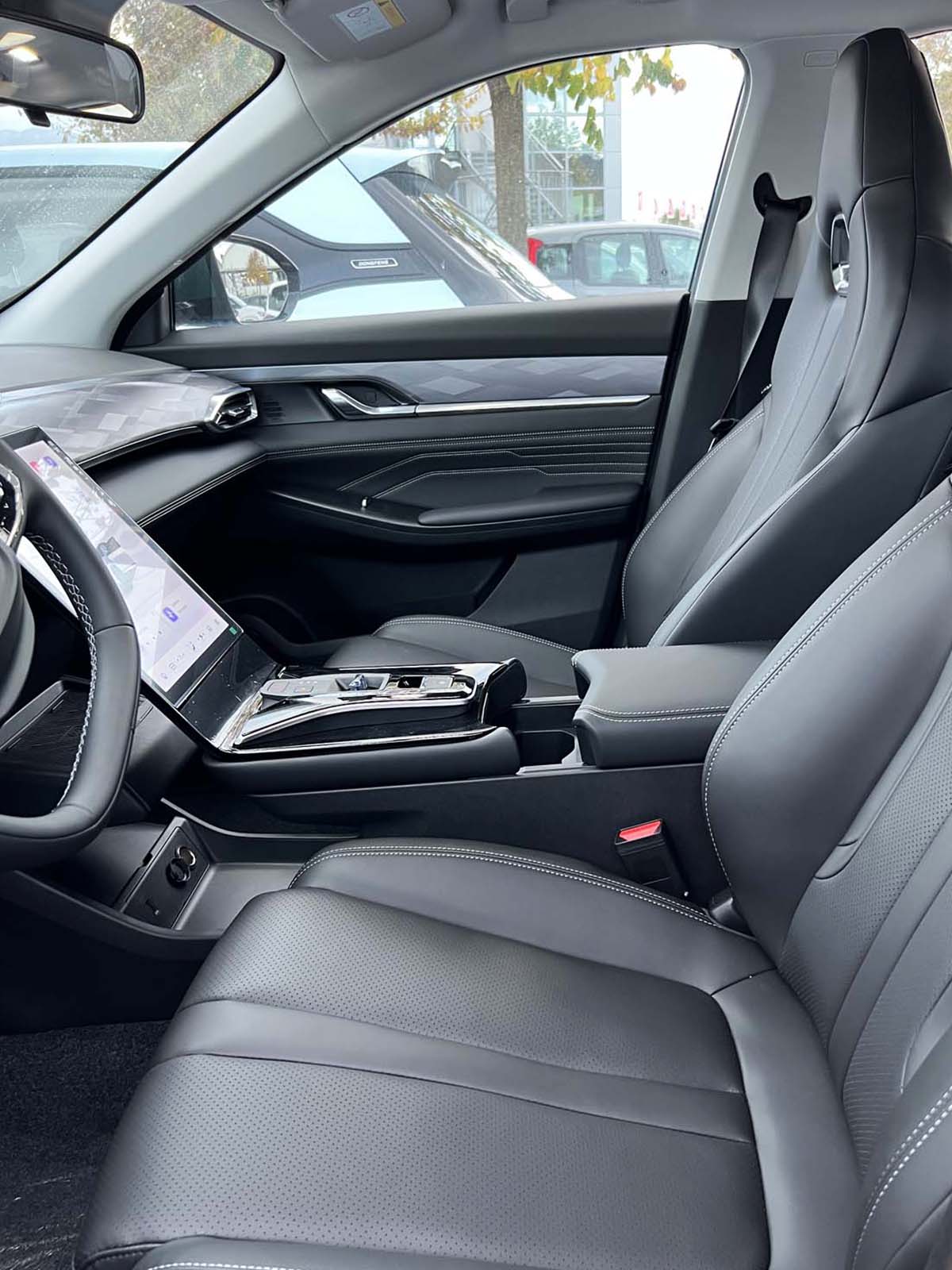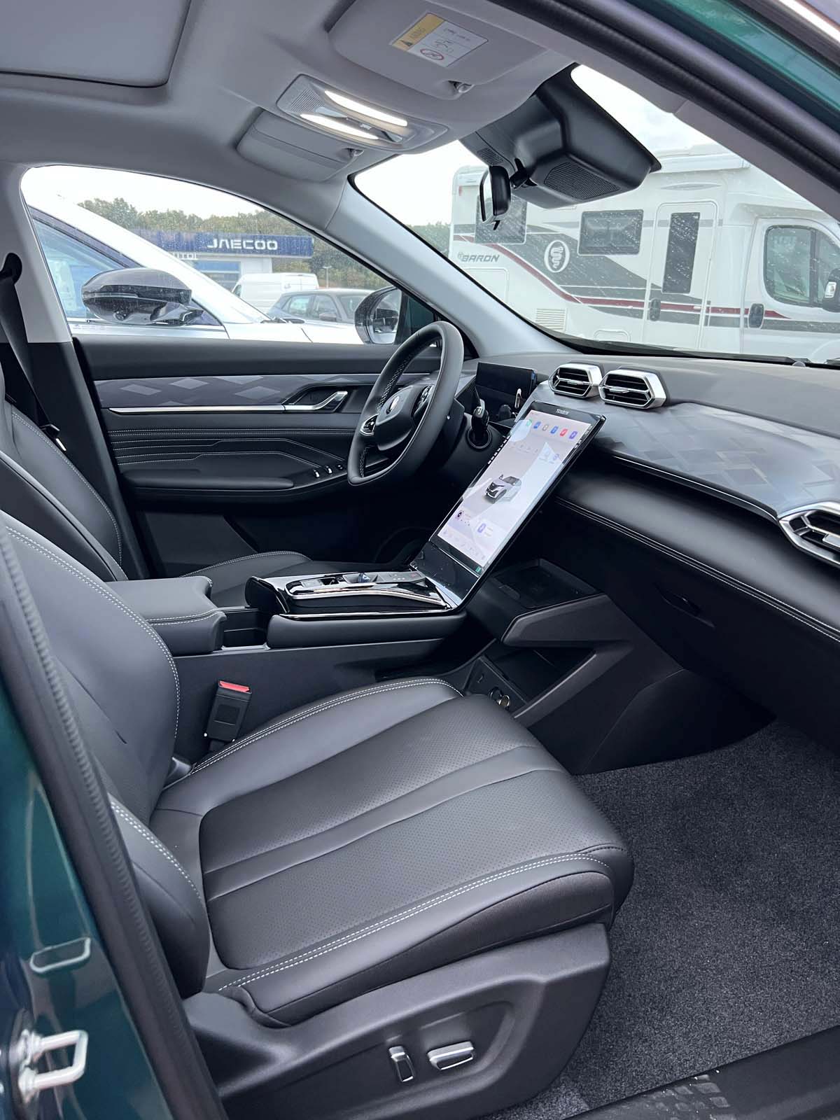 All’interno, la qualità dei materiali e la tecnologia a bordo sono elementi centrali: i sedili in pelle regolabili elettricamente, il cockpit digitale e il display touch screen centrale garantiscono un ambiente raffinato e funzionale. Il tetto panoramico amplia la luminosità dell’abitacolo, mentre la connettività wireless e le porte USB Type-C assicurano comfort in ogni viaggio.