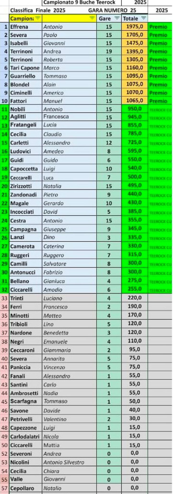 Con la cena delle premiazioni Teerock, ospitata presso l’hotel Fiuggi Terme Resort & SPA, si è ufficialmente chiusa la stagione sportiva 2025 dell’ASD Teerock Golf Team Fiuggi. L’appuntamento ha rappresentato il momento conclusivo di un’annata caratterizzata da un’elevata partecipazione e da risultati di rilievo.