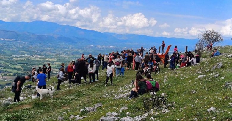 L’inaugurazione si è svolta con una lunga passeggiata di circa un’ora e mezza, il tempo necessario per raggiungere la cima partendo dal centro cittadino. Da via Roma, i partecipanti si sono inerpicati lungo un sentiero montano recentemente sistemato dall’amministrazione locale, per arrivare alla sommità del monte.